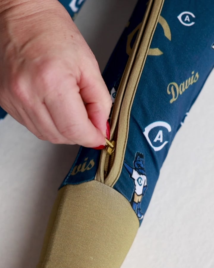 Featuring a bold all-over print of the UC Davis Aggies logos in signature blue and gold and certified safe by OEKO-TEX®, this spirited sleeper is perfect for game days, naptime, and everything in between. Shop our full UC Davis baby collection, including bamboo zippered onesies, one-piece sleepers, and Aggie-themed apparel. Whether you're looking for UC Davis baby clothes or toddler Aggies outfits, we’ve got your little fan ready to cheer.